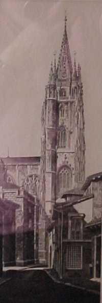 This etching depicts a church tower and small part of the church with houses in the foreground on each side of a narrow street. The street and nearly all the houses are in shade while the tower and church are in bright sunshine. This etching is part of a collection of 10 etchings by contemporary artists presented to Victoria Art Gallery, Bath; Central Library, Dundee; New Walk Museum and Art Gallery, Leicester and Astley Cheetham Public Library and Art Gallery, Stalybridge.