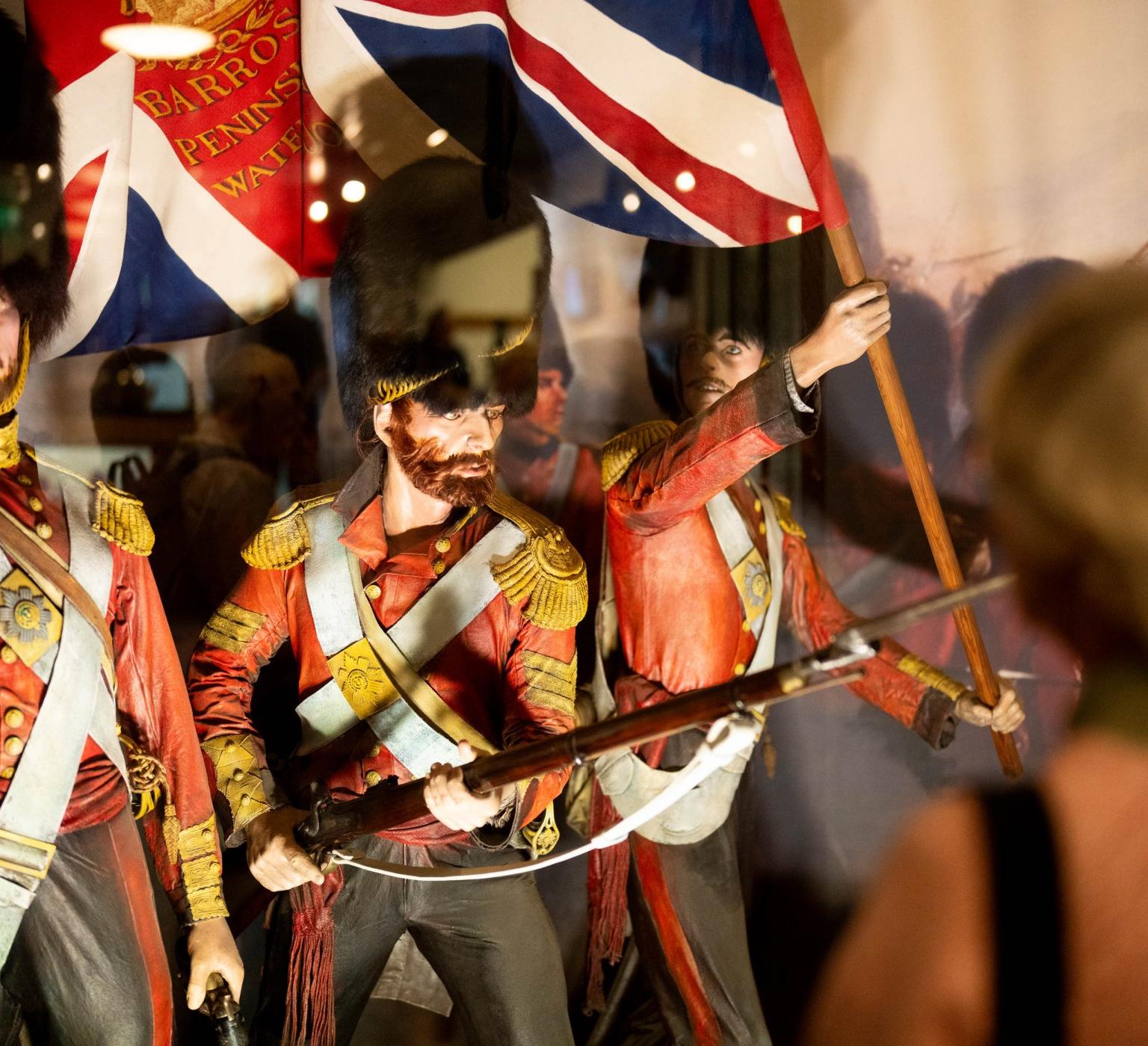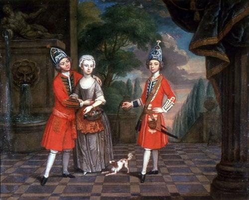 The painting shows two boys, probably of the Keppel family, the elder dressed as an officer in the Grenadier Company of the Coldstream Guards, and the younger as a private soldier in the same Grenadier Company. Between them is a young girl with her King Charles spaniel. It is interesting that the uniforms are so clearly portrayed and that their flintlock muskets are resting against the wall behind them. Apart from its general charm, the picture is most important in that it clearly portrays the uniforms worn by officers and privates of the Grenadier Companies of the Coldstream Guards in the early 18th century.