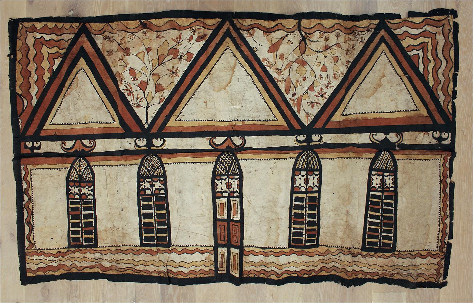 This painting from the Cook Islands is a fine example of Polynesian representational art from the colonial period. It is on barkcloth, a material made from soaking and beating the inner bark of trees. The arrival of Christianity introduced new forms of decoration, such as this image of a church.