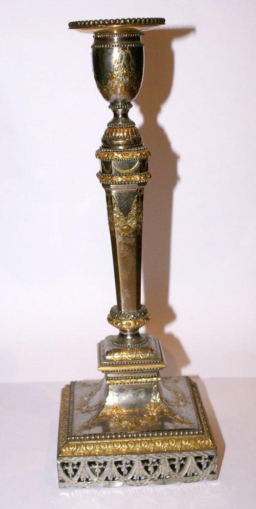 Pair of candlesticks in burnished steel with encrusted decoration in brass, silver and copper.