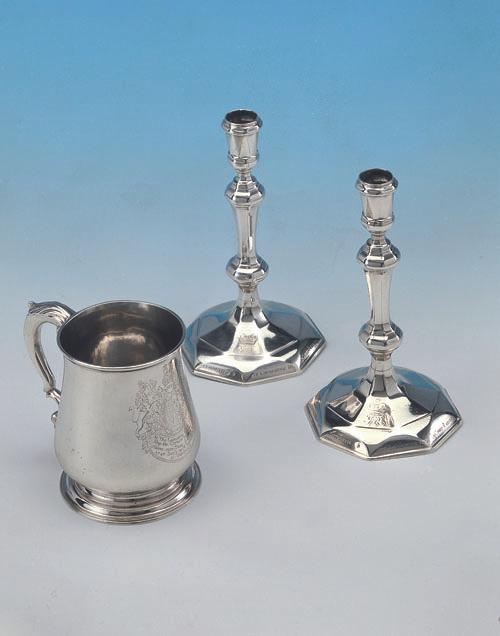Pair of admiralty 'launching' candlesticks. Engraved round each base:' At launchinng Her Maj.ts. Ship Ye Feurersham A 5th.Rate 22d July 1712 Burthen 561 Tuns 40 Guns 190 Men Built by Mr.John Philips Master Shipwright at Plymouth'.