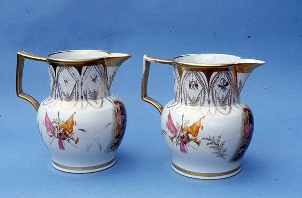 Pair of oviform jugs with cylindrical necks and gilt angular handles. Painted by J Smith of Bronseley. Decorated with martial trophies commemorative of the Wenlock Volunteers, formed when Britain declared war on Napoleon in 1793. Inscribed: VIRTUTI NIHIL OBSTAT ET ARMIS.
