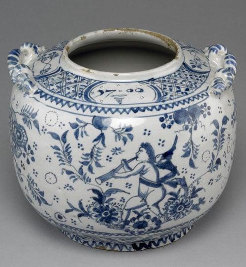 Pair of Delft dishes made at the Flowers factory c 1745, diameter: 35.6cm, (?)Thomas Rowland, painted with the 'Miraculous Draught of Fishes' and 'Abraham with Hagar and Ishmael'. Bristol Delft jar with monogram HWS, 1700, height: 12.7cm. Wards Temple Back factory, (?) Thomas Frank.