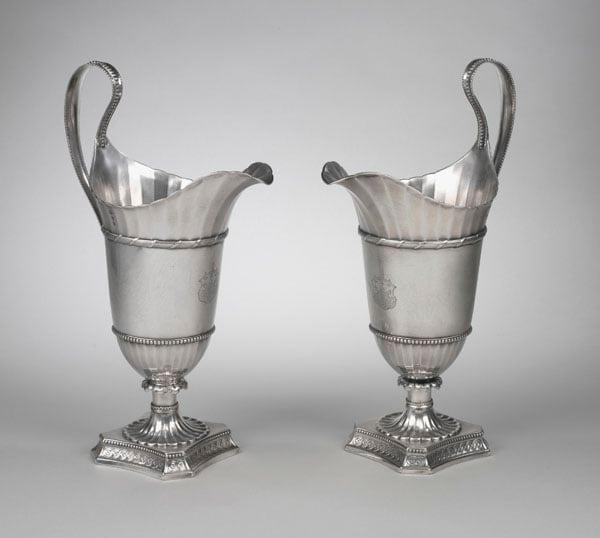 These ewers date from the pioneering years of Matthew Boulton's career as a silversmith and entrepreneur, when he was experimenting with the neo-Classical style. For a short period he employed the avant garde architect James Wyatt to provide him with designs for all kinds of silver objects and the form and ornament of these ewers correspond to these sources. The ewers relate to several other masterpieces of neo-Classicism at Temple Newsam and have a coolly understated sophistication which marks them out as objects of the highest quality.