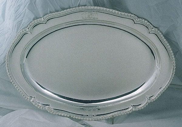 A pair of oval George III silver meat platters with shaped gadrooned borders. Each engraved twice with the coat of arms of 2nd Viscount Duncan of Camperdown. Hallmarked London 1804 and marked with Stroud's maker's mark.