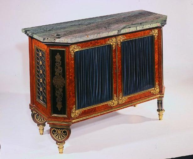 A pair of side cabinets from a suite of furniture commissioned for the Duke of Palmella, Portuguese ambassador to London. The cabinets have ormolu corner mounts, brass grilles at the sides, deeply chamfered corners with brass marquetry ornament and bellows-like feet. The top is of blue green mona marble (a limestone from Anglesey).