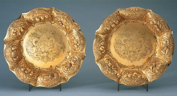 These dishes follow the fashion for revival silverware set by Rundell, Bridge and Rundell for the future George IV. The centre of the dishes are engraved with the arms of Fetherstonhaugh within a cartouche after a design by Stefana della Bella. The armorial shield is surmounted by two fighting seahorses, whose tails curl beside the shield.