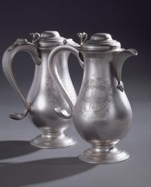 Pair of silver jugs. Pear-shaped outline resting on moulded circular feet. The plain handles have a bold scroll shape & support hinged dome lids, the sides have finely engraved rococo cartouches displaying the arms of the City of York.