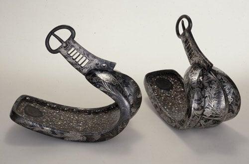 Pair of Daimyo stirrups, inlaid with silver, with mother-of-pearl on the inside. The stirrups are decorated with floral and spiral patterns.