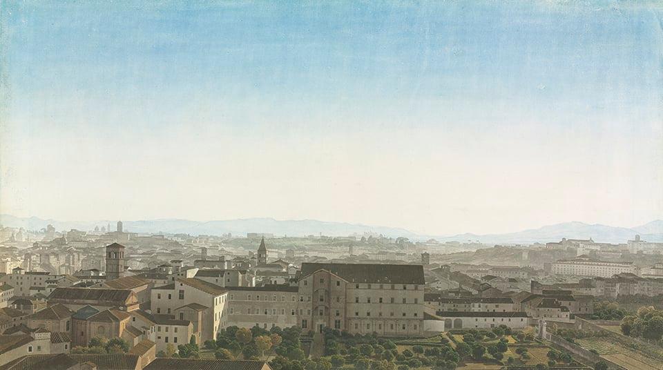Panoramic view of Rome from Piazza San Pietro in Montorio on the Janiculum: From the Capitoline Hill to the Aventine Hill, with Trastevere in the foreground, the gardens of the convent of San Callisto and San Michele, c. 1778