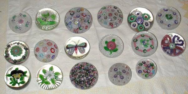 1-17) collection of 17 19th century French paperweights (illustrated), 18-27) 10 pieces of old Spanish glass; 28) glass cameo plate by Anna Ehrner, Kosta Boda; 29) Vase with coloured cane portrait drawing by William Bernstein, 1986; 30-1) Pair of Commedia dell'Arte figures for Venini, Murano; 32-3) Pair of glass birds for Venini, Murano; 34) perfume bottle with millefiori stopper; 35) smoke grey bottle, Murano; 36-39) 4 stained glass roundels of the Four Elements by Dorothea Kettlewell; 40) 18th century tableau in glazed box. Part of a gift to 19 museums by Joan Hurst through the Art Fund in 2002.