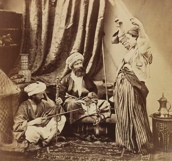 Fenton created Pasha and Bayadere in 1858 as part of a series of photographs inspired by his recent expedition to photograph the Crimean War. It is an important and beautiful expression of an orientalist theme in British art of the nineteenth century and reflects the Victorian fascination with the ‘exotic’ east. Fenton himself appears as the ‘Pasha’ and the musician is the English landscape painter, Frank Dillon, who originally owned the print.