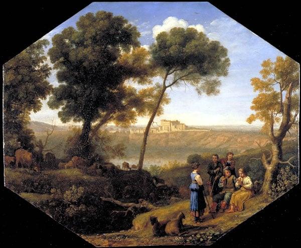 Two octagonal paintings. Known as the Barberinin Claude, painted for Pope Urban VIII, Maffeo Barberini - a great art patron. Rustic figures in a landscape with the Pope's palace in distance.