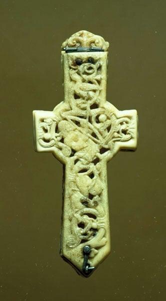 Reliquary cross, carved with foiliate decoration and symbols of the Evangelists. The cross is in fact a small box carved and pierced in low relief to form a case for an inner gold box (lost).