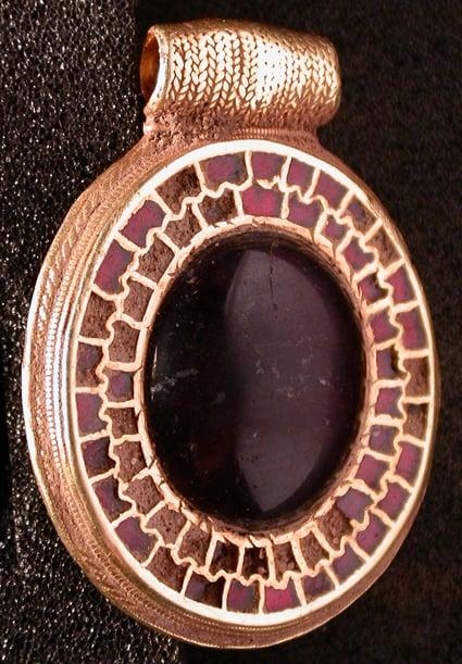 The pendant is composed of a well polished garnet, surrounded by a border of small rectangular cloisonné garnets set over patterned gold foil. Each is cut with a single notch and set to form an interlocking frieze.