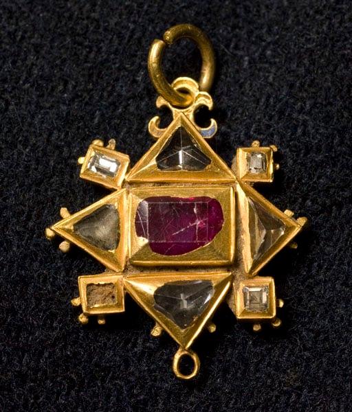 This pendant is made of gold set with diamonds and a single ruby decorated with enamel. It is from the late Tudor period and notable for the use of diamonds. Pendants such as this were worn by aristocratic, or even royal, women in various ways; attached to clothing or hanging from chains or ribbons. Colchester and Ipswich Museum Service has a collections of portraits of individuals wearing costume and jewellery of the same period.