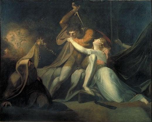 A woman in white clasps the central figure, who is about to strike a cloaked man on the floor with a sword. The lighting and exaggerated poses are very theatrical. Fuseli often depicted knightly heroics and lesser known legends in his early works.