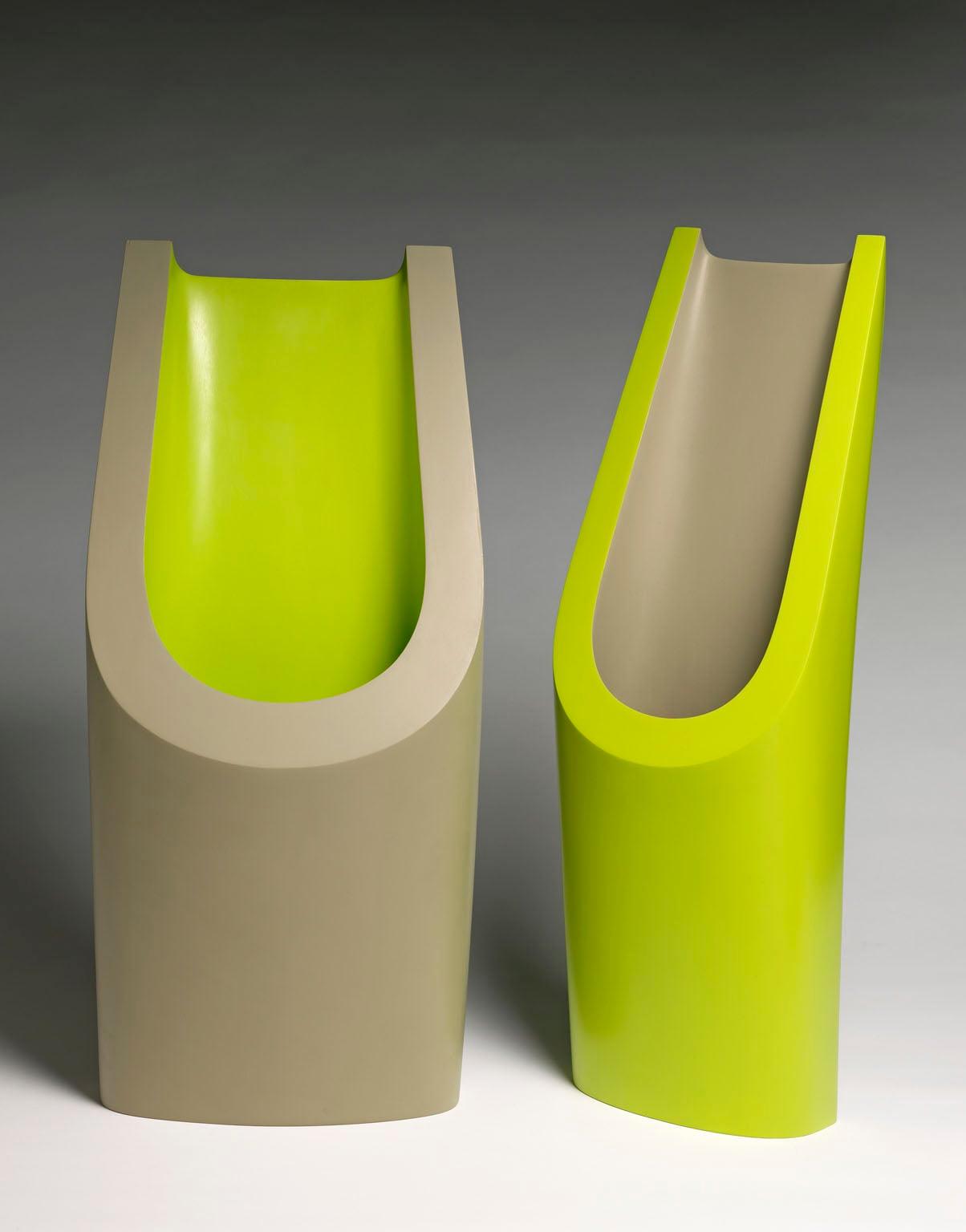 These two complementary vases – one in neon green with a matte-grey interior, the other in the same colours but inverted – were inspired by the myth of Persephone, goddess of renewal.