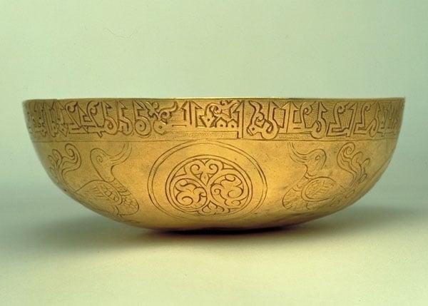Winebowl found at Nihavad decorated with birds, roundels and a couplet in Arabic (Kufic characters) on wine.