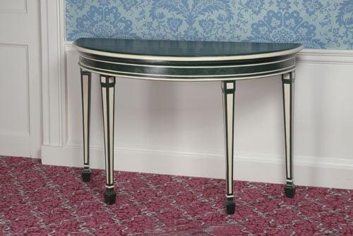 Table with mahogany top veneered with marquetry in sycamore, satinwood, box, rosewood, etc. The frame is beech, carved & painted. Made for the Circular Dressing Room at Harewood House, Yorkshire. On long-term loan from the Chippendale Society.