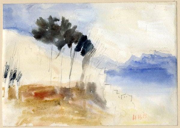 A landscape in the manner of Turner. One drawing from a collection of 58 drawings, mostly of the British School, from the Herbert Powell Collection of British Watercolours. Dr Herbert Powell formed a valuable collection of watercolours and drawings. He had earlier gifted some works from the collection to the Art Fund in 1929 to function as a Loan Collection for public institutions. These works were later permanently distributed by the Art Fund amongst various public collections in 1968.