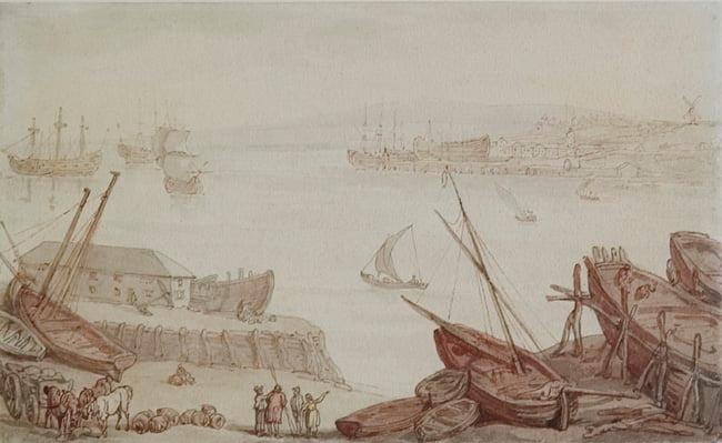 Maritime view of Plymouth harbour, with boats at sail and in dry dock, by the 18th-century caricaturist and watercolourist Thomas Rowlandson. The work is painted in a palette of warm brown and cool grey-blues. In the foreground are lively figures of people and horses.