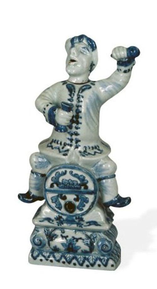 Urn in the form of a Bacchanalian figure of a man seated astride a barrel, the head serves as a lid. Japanese (Imari) porcelain copied from Dutch delft and painted in an underglaze blue.
