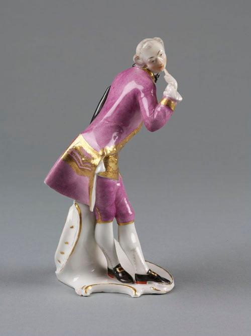A figure of a man kissing his hand, probably intended for Ottavio from the Italian Comedy; painted in pale mauve enamel with much gilding.