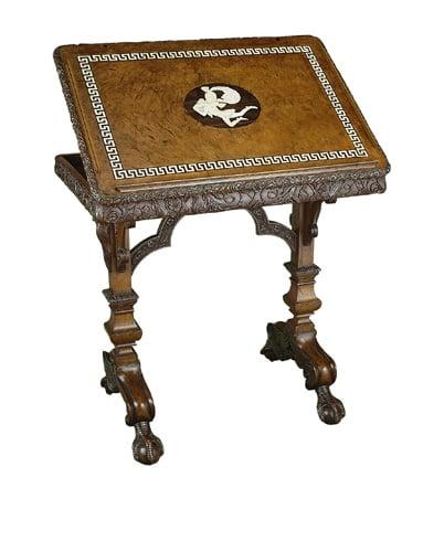 Table on winged ball and claw feet, carved legs, inlaid with ivory and ebony showing Mercury bearing Pandora to earth within an ivory Greek key border. The edge is carved with a running pattern of flowers and foliage.