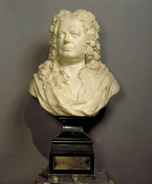 Portrait bust of James Gibbs (1682-1754) dressed in wig and open shirt. An engraved brass plaque set in a black marble block added to the socle records the gift of the bust of St Martin's by a certain William Boore in 1885.