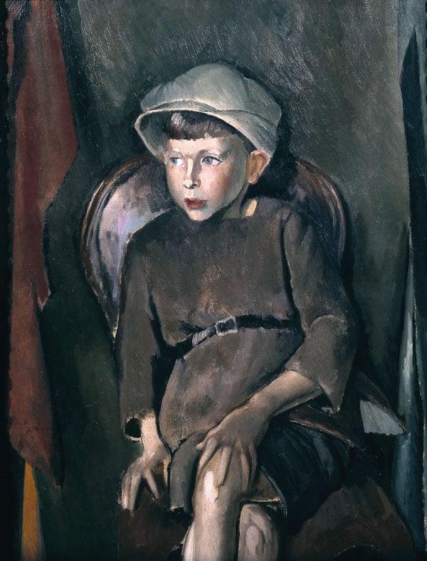 Three-quarters length figure of a young boy seated in a chair dressed in a brown tunic, grey knickerbockers, light grey cap. The background is grey with red drapery to the left, and grey-blue drapery to the right.