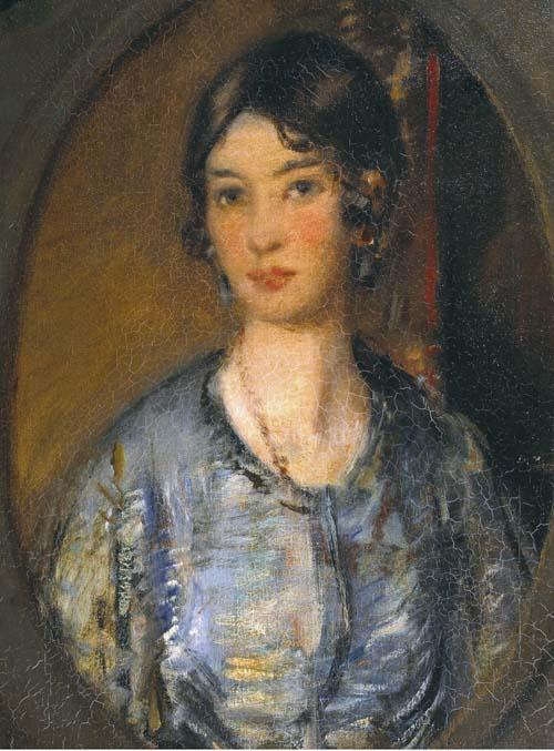 This head and shoulders study in a painted oval is of a girl in a blue silk dress, wearing blue earrings, against a brown background. Her complexion is fair, her eyes dark blue and her hair dark brown. One of twenty seven gifts to seven museums by A E Anderson through the Art Fund between 1922 and 1938.