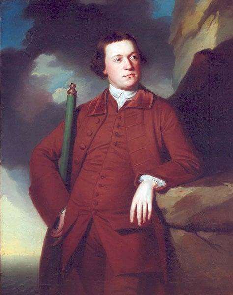 Three-quarter-length portrait of Abraham Rawlinson (1738-1803), a Whig MP for Lancaster from 1780-1790. It shows the sitter, telescope in hand, standing against a coastal background to demonstrate his mercantile interests. The Rawlinson family had numerous business interests in the West Indies and profited from the transatlantic slave trade during the 18th century.