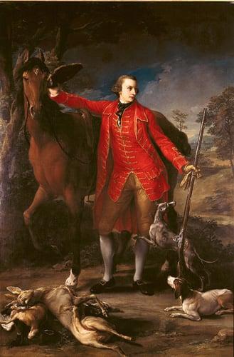 The sitter was reputed to be the most handsome man in Scotland and the peer with the largest number of dependants. Rural pursuits were his passion and it is as a sportsman that he has chosen to be depicted by Batoni. Gordon is seen in a scarlet English hunting frock suit, with the somewhat meagre spoils of the day's game at his feet and Gordon Castle in the background. His pose is loosely related to the Apollo Belvedere and recalls the equestrian portraits of Van Dyck. Batoni typically combined nonchalant yet elegant poses with dazzlingly-realized fashionable clothes and relevant antique sculptures to achieve personable likenesses. Yet within these standard ingredients his portraits show remarkable inventiveness and mastery at capturing the individuality of his sitters. This work was acquired with assistance from the Wolfson Foundation.