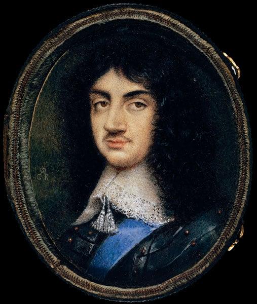 This miniature depicts Charles II (1630 - 1685) in early adulthood, the period of his coronation as King of Scots in 1651. He wears armour, an embroidered white lawn collar with tassels and blue Garter ribbon. His natural hair is worn long and he has his trademark moustache. David des Granges accompanied Charles to Scotland that year, and was appointed His Majesty's limner in Scotland. From The Albion Collection of portrait miniatures.