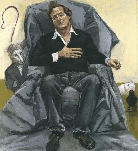 Full length portrait of the playwright David Hare (born 1947). Rego assumed the role of director for the work and suggested that Hare stared contemplatively into the distance with his right hand over his heart in a dramatic devotional gesture. There is a suggestion of a play or a performance taking place but the meaning is unclear. The lamb and crook could be a veiled reference to St. John the Baptist and a theatrical mask lies on the floor.