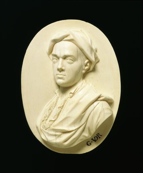 Anglo-Flemish Ivory portrait plaque in relief, with inscription on the back identifying the sitter as Hamlet Winstanley (1698-1756), a Lancashire painter who was born and died at Warrington. Frame in wood and glass.