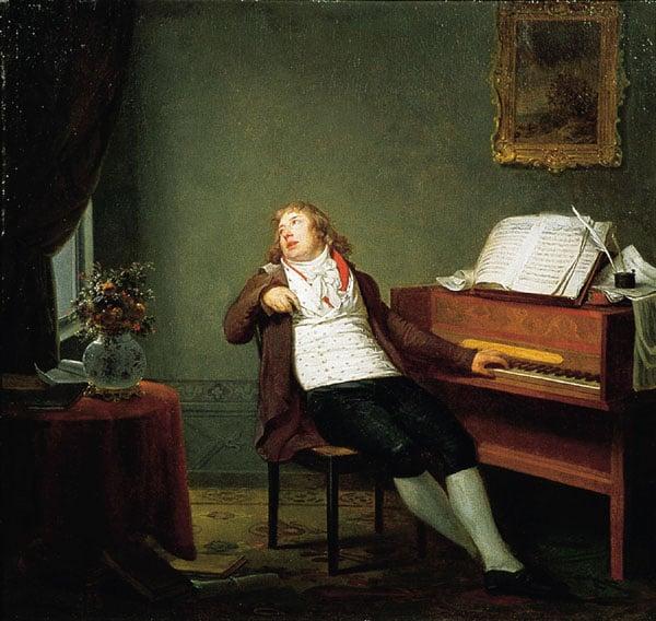 The composer is depicted lounging at his piano. there is table with a vase of flowers beside a window on the left and a painting hangs above the piano. The sitter gazes out of the window and rests his left hand on the piano keys.
