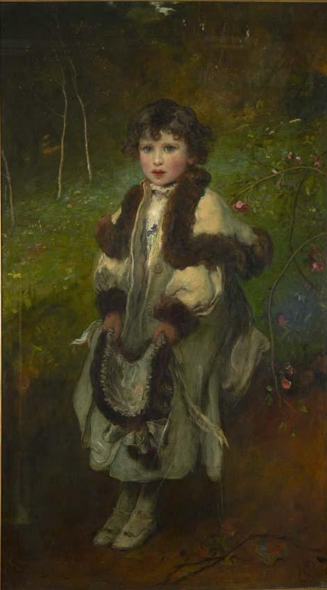 This portrait is of the donor, Julie, daughter of Spencer H. Gollan, as a child. She is shown full-length in a landscape, sitting on a bank, wearing a white fur-trimmed coat with cape and holding a bonnet.