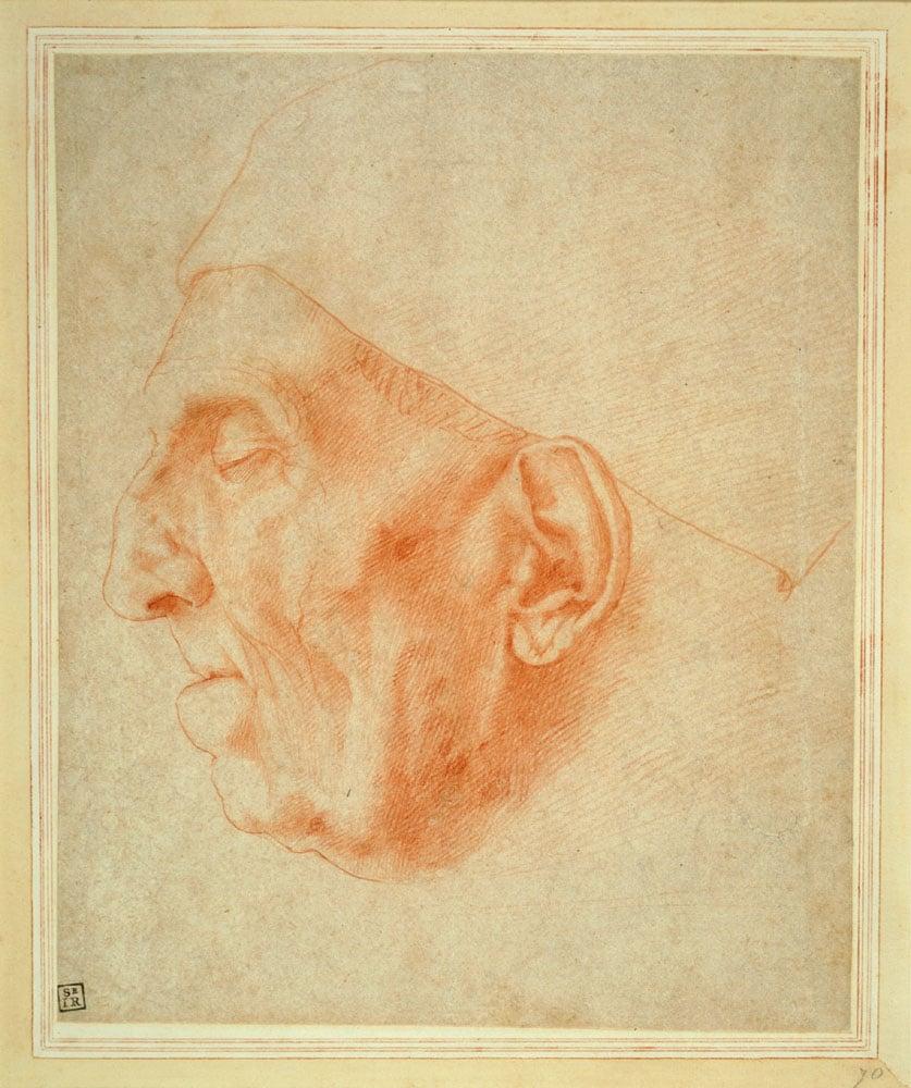 Part of a twenty-three set of drawings presented as a gift to the British Museum, this drawing was initially attributed to Domenico Guirlandaio and thought to depict Pope Adrian VI, but has been reattributed to Sangallo due to the drawing's striking resemblance to the head of Leonardo Buonafede on the artist's monument in Florence. Buonafede was a Carthusian monk who was bishop of Cortona from 1529 until 1538, when he resigned. He is depicted on his deathbed, his biretta is only indicated but the rest is carefully finished.