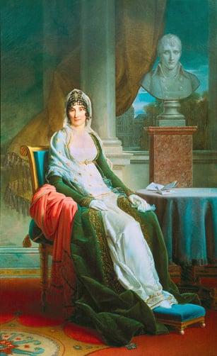 Portrait of Madame Mere (Letiza Bonaparte, nee Ramolino 1750-1836). She is dressed sumptuously in the Empire style beside a table bearing a bust of Napoleon laureate.