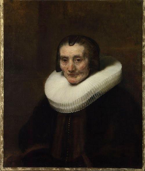 Three-quarter length portrait of Margaretha Trip seated in an armchair, wearing a black dress and white ruff. Signed: Rembrandt f / 1661.