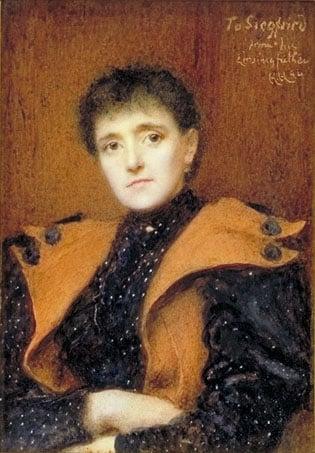 Herkomer's first two wives died early into marriage but in 1888 he married Margaret, the sister of his late second wife and subject of this portrait. Herkomer made his home and studio in Bushey in 1873.
