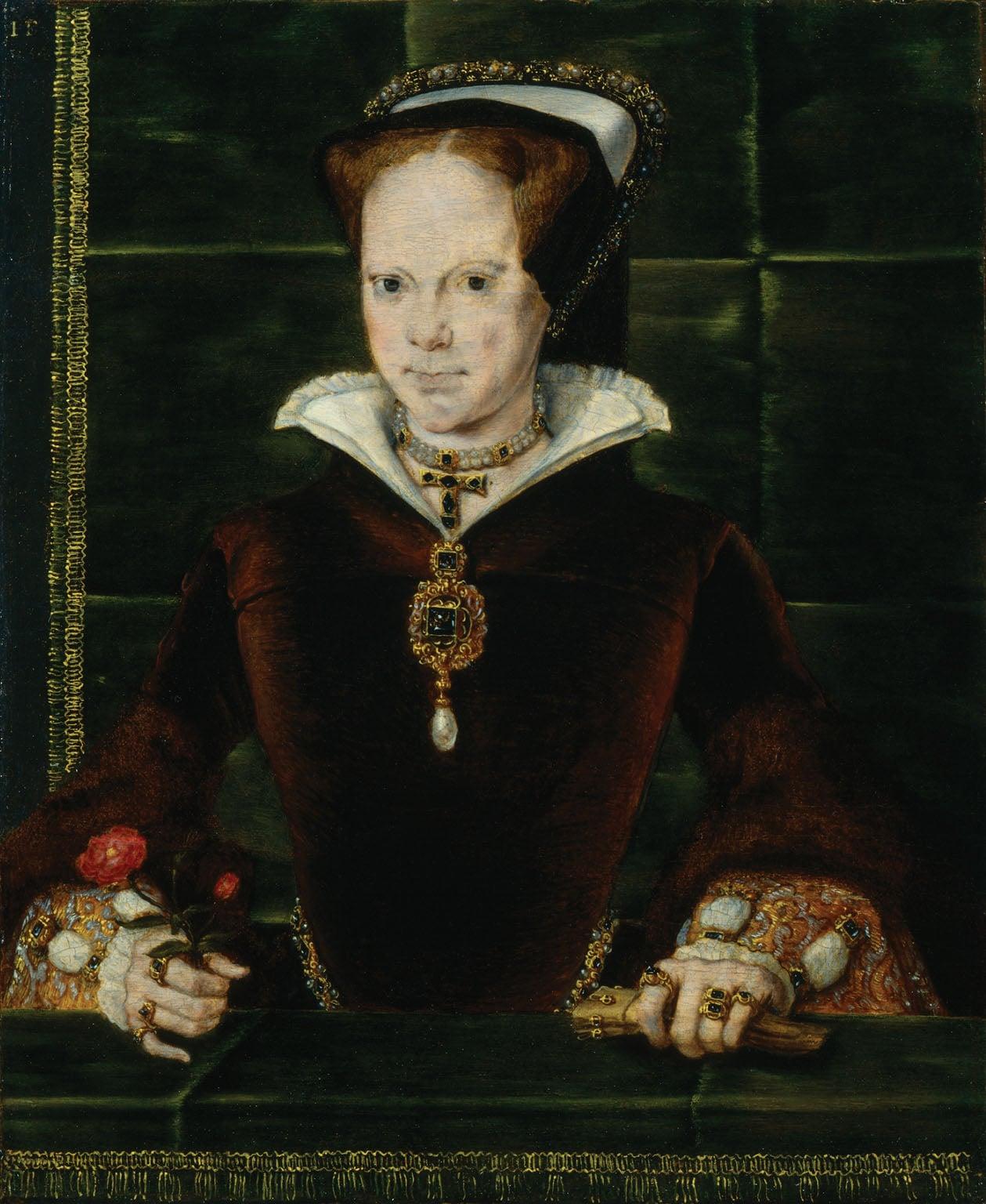 Portrait of Mary I, (1516-1558). All the known portraits of Mary I as Queen derive from two sittings which both took place in 1544. Here she wears the pendant pearl, 'La Peregrina', given to her by Phillip of Spain in 1544, the year they were married. Inscribed HE in top left corner.