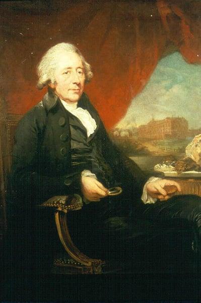 Matthew Boulton is shown seated, three quarter length, with the Soho manufactory in full production in the background. He is depicted as a confident and successful entrepreneur.
