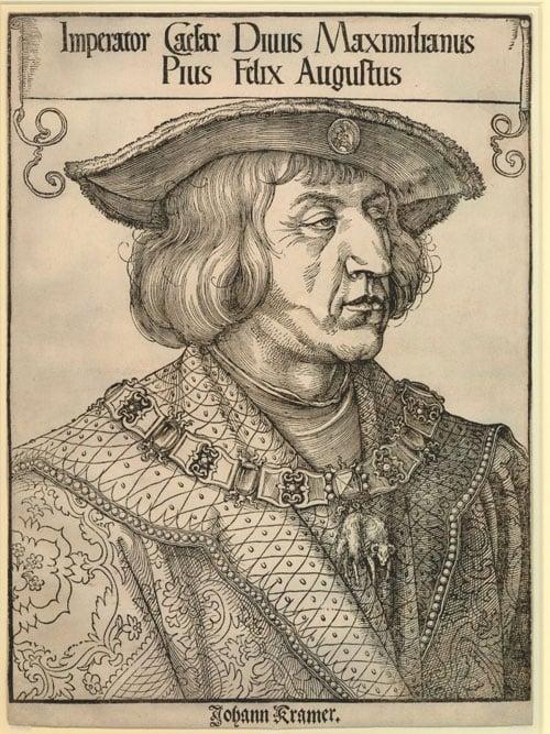 Portrait of Maximilian I, Bartsch 154, a woodcut from Durer's drawing of 1518. Marked with the name of the publisher, Johann Kramer.