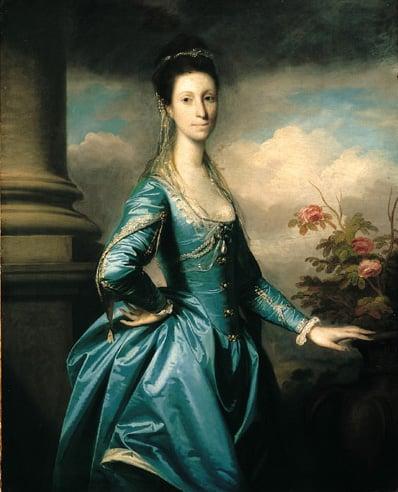 A three-quarter length portrait of Miss Elizabeth Ingram in a blue dress, standing turned to her right and looking at the spectator. The sitter's left hand rests on the edge of a stone vase containing pink roses; her right hand is on her hip. A cloudy sky behind and a column left. Miss Ingram, who came of a Wakefield family, was born in 1733 and died unmarried in 1785.