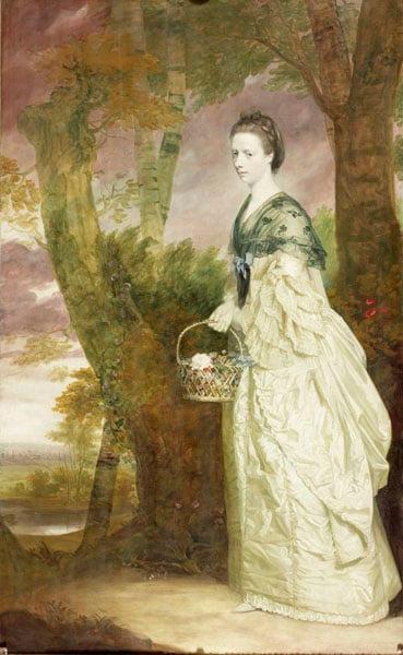 The sitter is shown full-length, standing, and turned half-left. She wears a white dress, her shoulders draped with a black scarf, and holds a basket of flowers. There is a landscape background, with trees framing the figure. The general colour scheme is high in key, with a cool green prevailing.