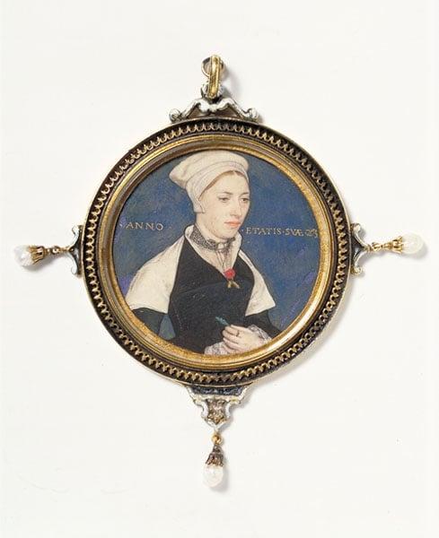 A circular miniature of Jane Small that was originally catalogued as Mrs Robert Pemberton. She wears a black dress and a white chemisette, clasped with a golden collar. On her corsage is a red carnation, and she holds a leaf. The background is ultramarine blue. Mr Pemberton's coat of arms is on the back. Jane SmallÂ’s maiden name was Pemberton and she was the wife of Nicholas Small, a rich London merchant. The attribution is thought more likely than that of Mrs R Pemberton, the wife of an obscure Northamptonshire country gentleman.