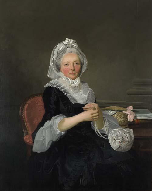 Portrait of Mrs Pearce, daughter of Mrs Bryan, in black satin dress with white sleeves, white fichu and mob-cap, seated at a table lace-making.